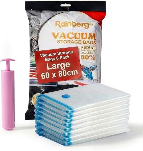Rainberg 8 Pack Large Vacuum Storage Bags, Home and Travel Vacuum Bags with Pump featuring Double Zip Seal & Triple Seal Turbo-Valve for Maximum Space Saving, Up to 80% More Space (60 x 80cm)