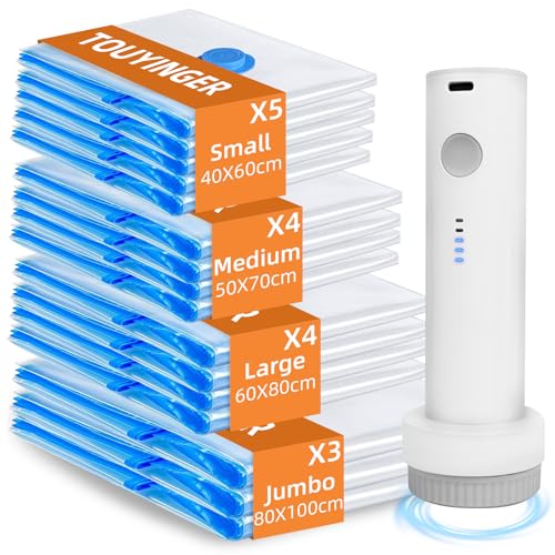 TOUYINGER Vacuum Storage Bags for Clothes, 16 Pack Travel Vacuum Bags with Wireless Pump, Reusable Space Saver Bags for for Travel and Home