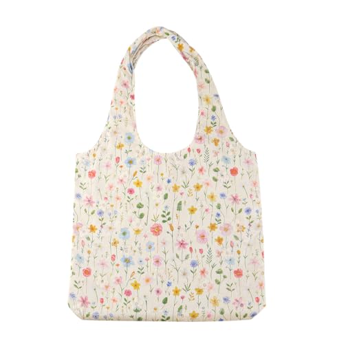 AdiStylinno Canvas Tote Bag, Embroidery Large Capacity Shopping Bags Ladies Cute Washable Grocery Bags, Colorful Flower Shoulder Bag for Travelling, Shopping, Work, Daily Use (Flower-Beige)