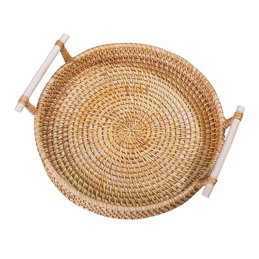 Hand-woven Rattan Round Basket Tray with Handle for Breakfast Drink Snack Coffee Tea Bread Fruit Food Storage Platters Plate