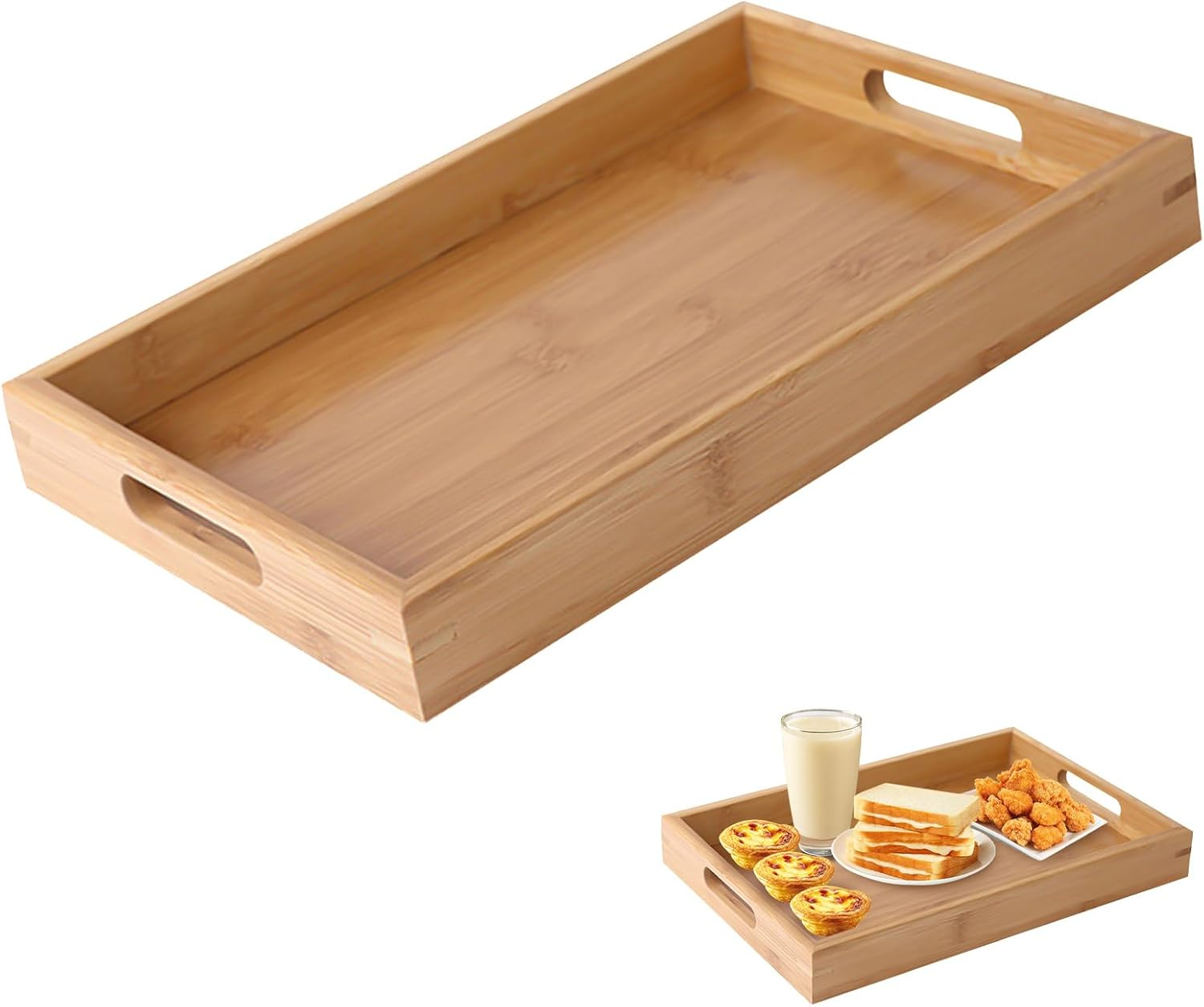 Bamboo Serving Tray Rectangular - Food Tray with Handles, for Breakfast, Dinner,