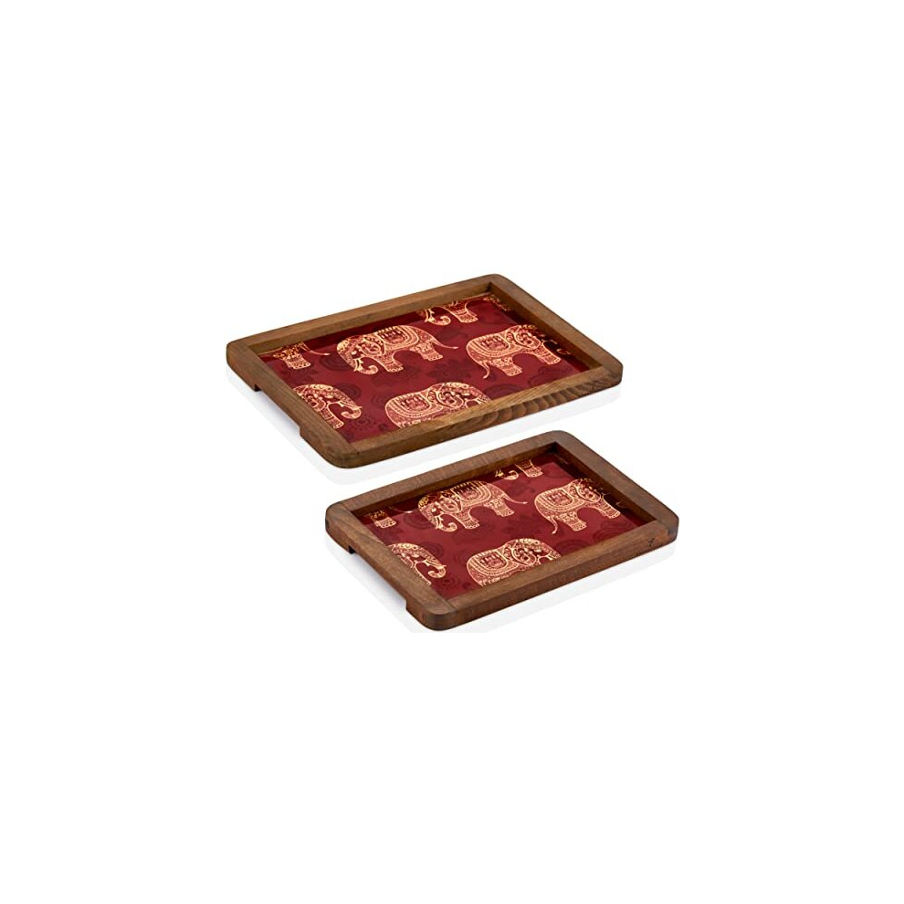 Handmade Set of 2 Large and Small Decorative Wooden Serving Tray | Rustic Wood Drinks Tray for Coffee & Tea Table | Food tray for Dinner & Breakfast