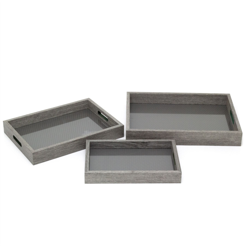 Set of 3 Grey Weave Serving Trays | 3 Piece Wooden Kitchen Trays with Handles | Tea and Coffee Tray for Breakfast