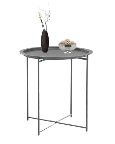 KHAPALWAK Metal Tray Table, Small Round End Table with Removable Round Tray, Waterproof Folding Tray Metal Side Table, Coffee Table Sofa Side Table for Living Room Bedroom Balcony and Office