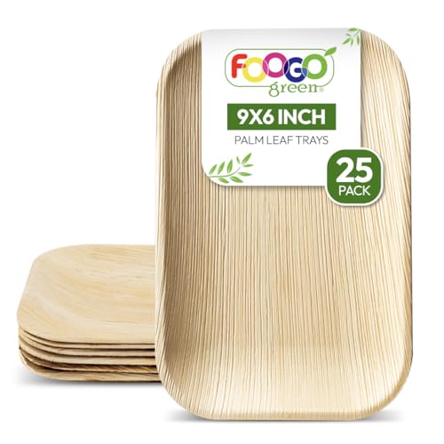 FOOGO Green 25 Disposable Palm Leaf Serving Trays, Medium 9x6 inch (22x15cm), For Starters And Desserts, Parties, Sturdy, Eco Friendly, Biodegradable Like Wooden Trays For Hot Food