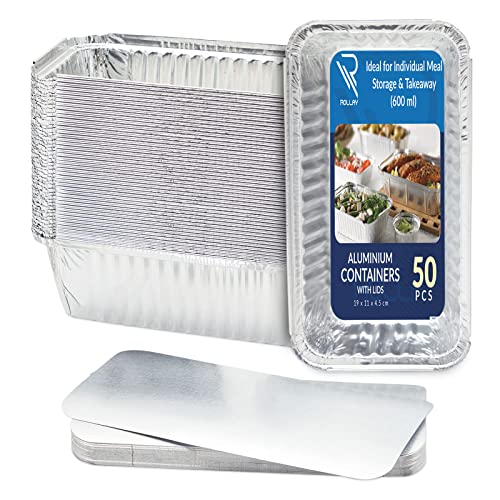 Rollay 50 Pack Aluminium Foil Food Containers with Lids 600ml - Tin Foil Trays with Lids for Food Storage, Baking, Roasting, Takeaway, and Party - Disposable Food Storage Containers