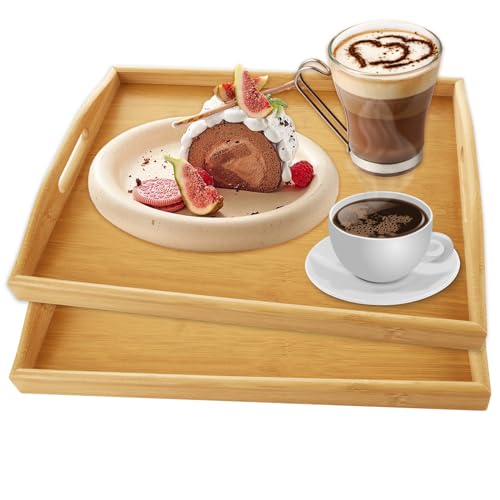 SHUESS 2 Pack Wooden Tray - 40 x 30 x 5cm Rectangular Bamboo Tray with Handles - Trays for Food Serving - Large Serving Tray with Handles for Breakfast, Tea, Coffee, Eating