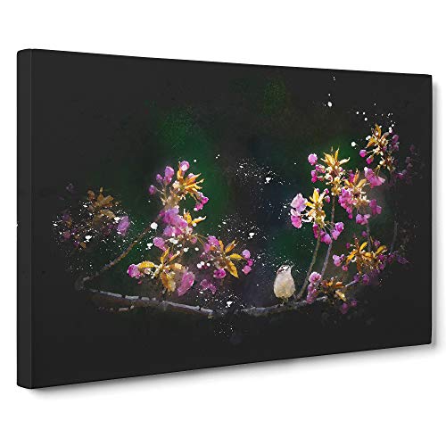 Wren Upon a Blossom Tree Branch Paint Splash Canvas Print | Gallery Wrapped 30mm Frame Wall Art | 30x20 inches | Ready to Hang | Modern Floral Picture | Living Room Bedroom Lounge Office
