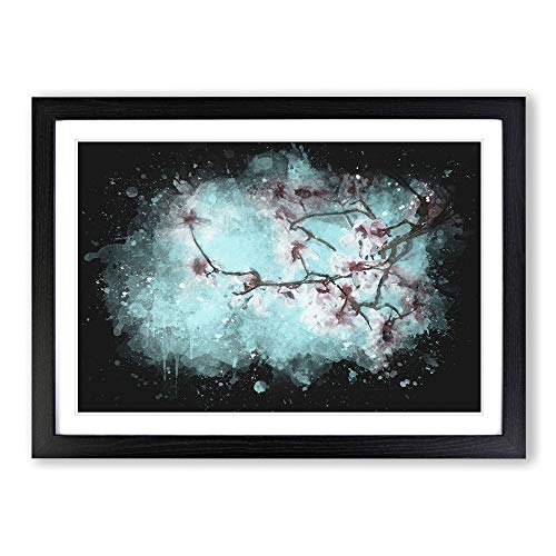 Blue Cherry Tree Flowers Paint Splash Framed Print | A2 Black Framed Wall Art | Ready to Hang | Modern Floral Picture | Living Room Bedroom Lounge Office