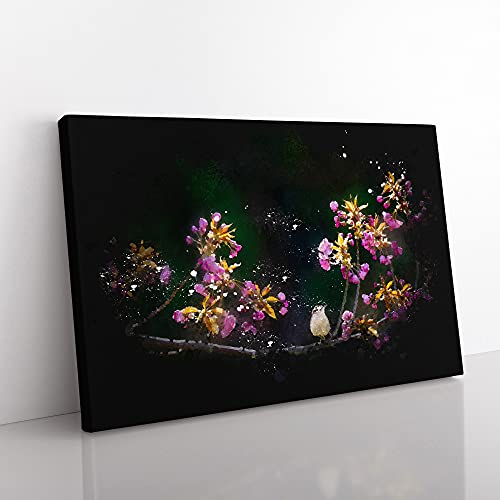 Big Box Art Wren Upon a Blossom Tree Branch Paint Splash Canvas Wall Art Print Ready to Hang Picture, 76 x 50 cm (30 x 20 Inch), Black, Brown, Purple