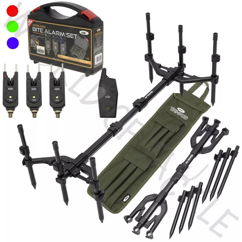 NGT 3 Rod Pod and Wireless Alarm Set Receiver Carp Fishing TRI-POD Carry Case