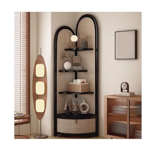 BYRTJSWX 5-Tier Corner Shelf, Multi-Functional Rattan Triangle Bookshelf with Storage Basket, Solid Wood Floor Standing Cabinet for Living Room, Bedroom, Office(Black)