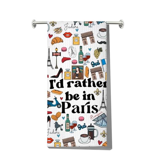 LEVLO Eiffel Tower Kitchen Towel France Paris Travel Gifts I'd Rather Be in Paris Tea Towel Paris Trip Housewarming Gift (in Paris Towel)