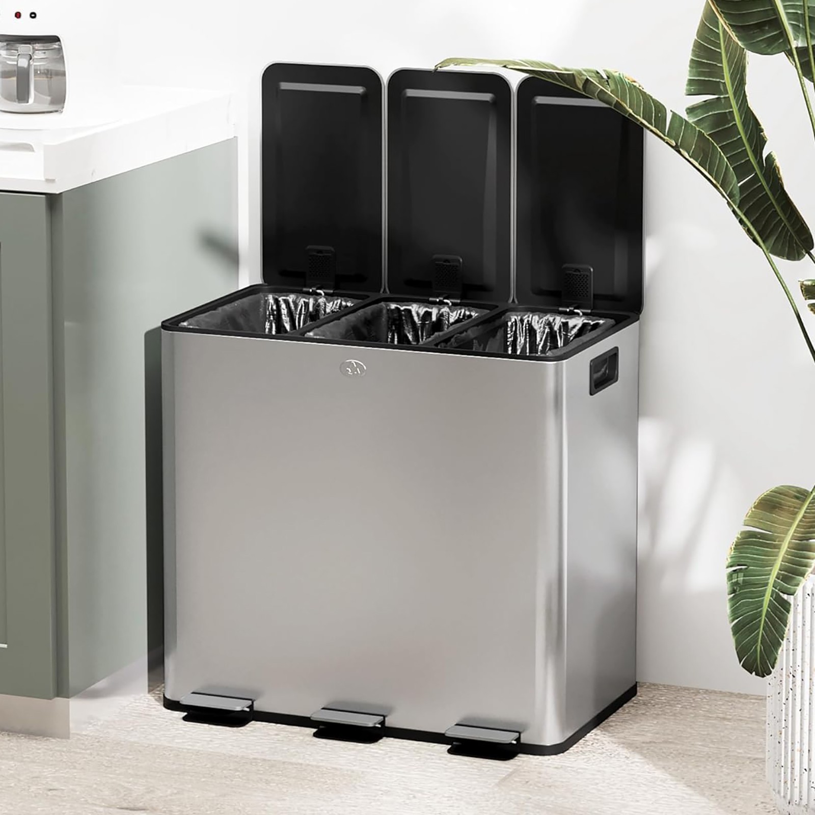Homra Triple Kitchen Bin Large 3x18l – Triplet Rubbish Bins 3x18l - 3 Compartment Pedal System – Trio Section Waste&Recycling Separation – Soft Close – Inner Buckets with Handles - Stainless Steel
