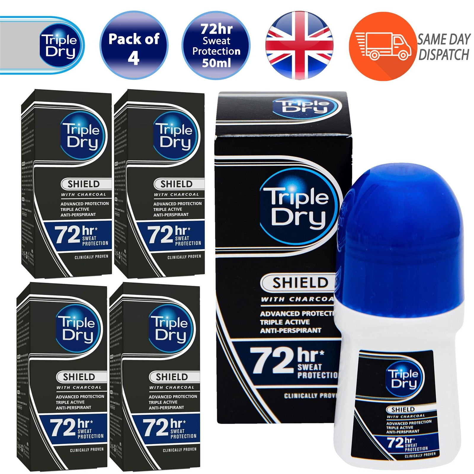 Triple Dry Shield Men Roll On Deodorant Charcoal Anti-Perspirant 50ml Pack of 4