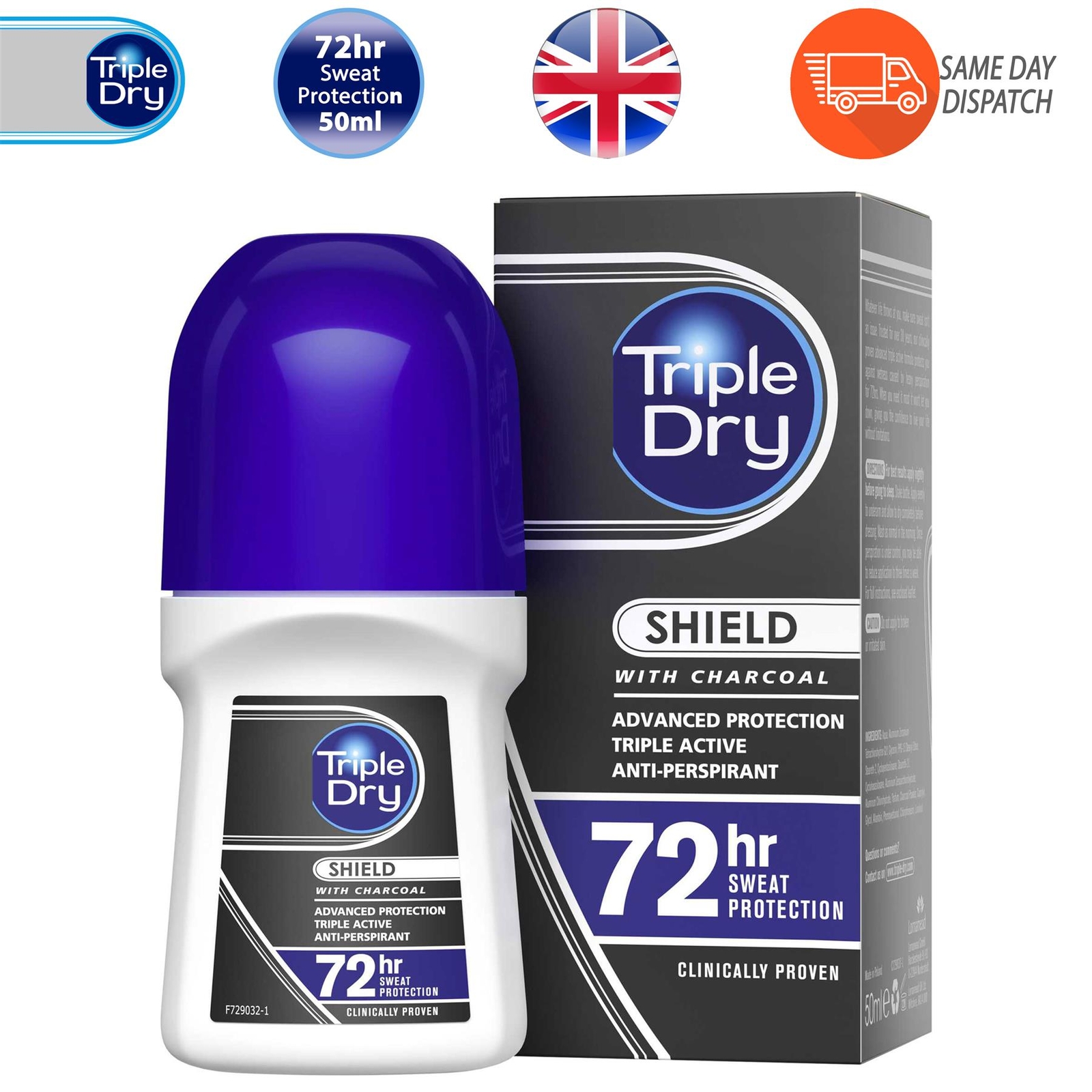 Triple Dry Shield Men Roll On Deodorant Charcoal Clinically Proven Formula 50ml