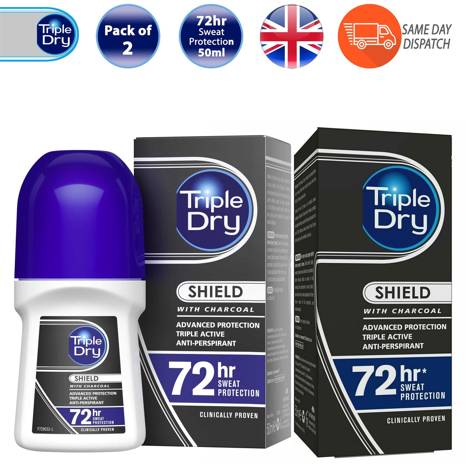 Triple Dry Shield Men RollOn Deodorant Charcoal Clinically Proven Formula 50mlx2