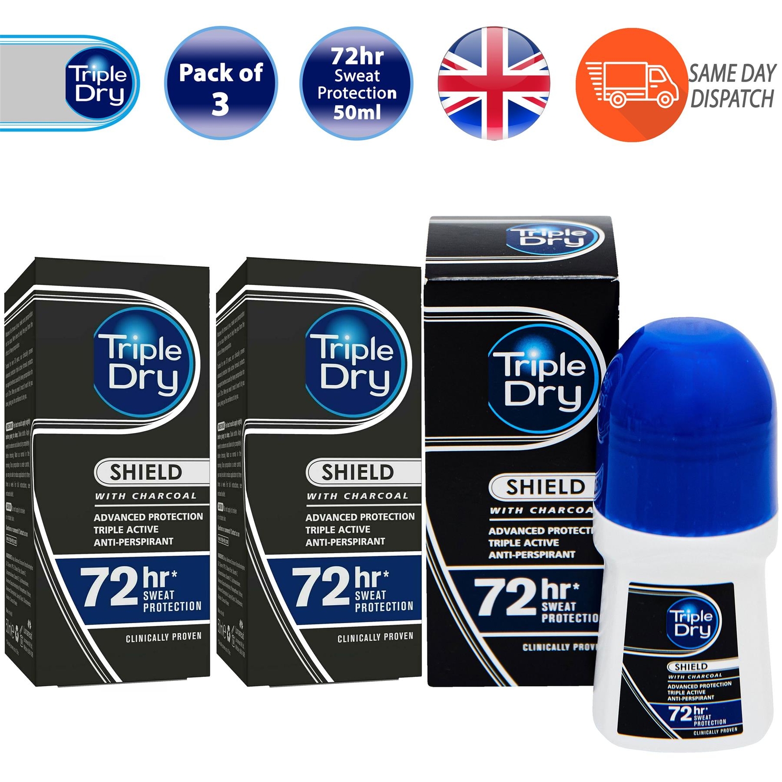 Triple Dry Shield Men Roll On Deodorant Charcoal Anti-Perspirant 50ml Pack of 3