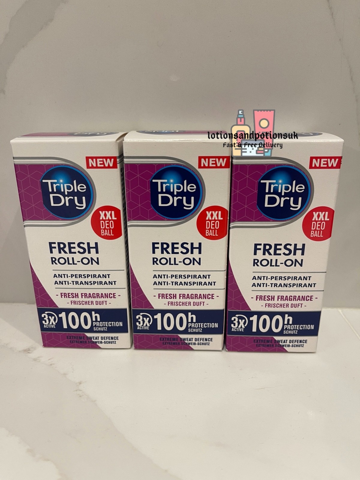 3 Triple Dry FRESH FRAGRANCE Up to 100HR Anti Perspirant Roll On Deodorant 50ml
