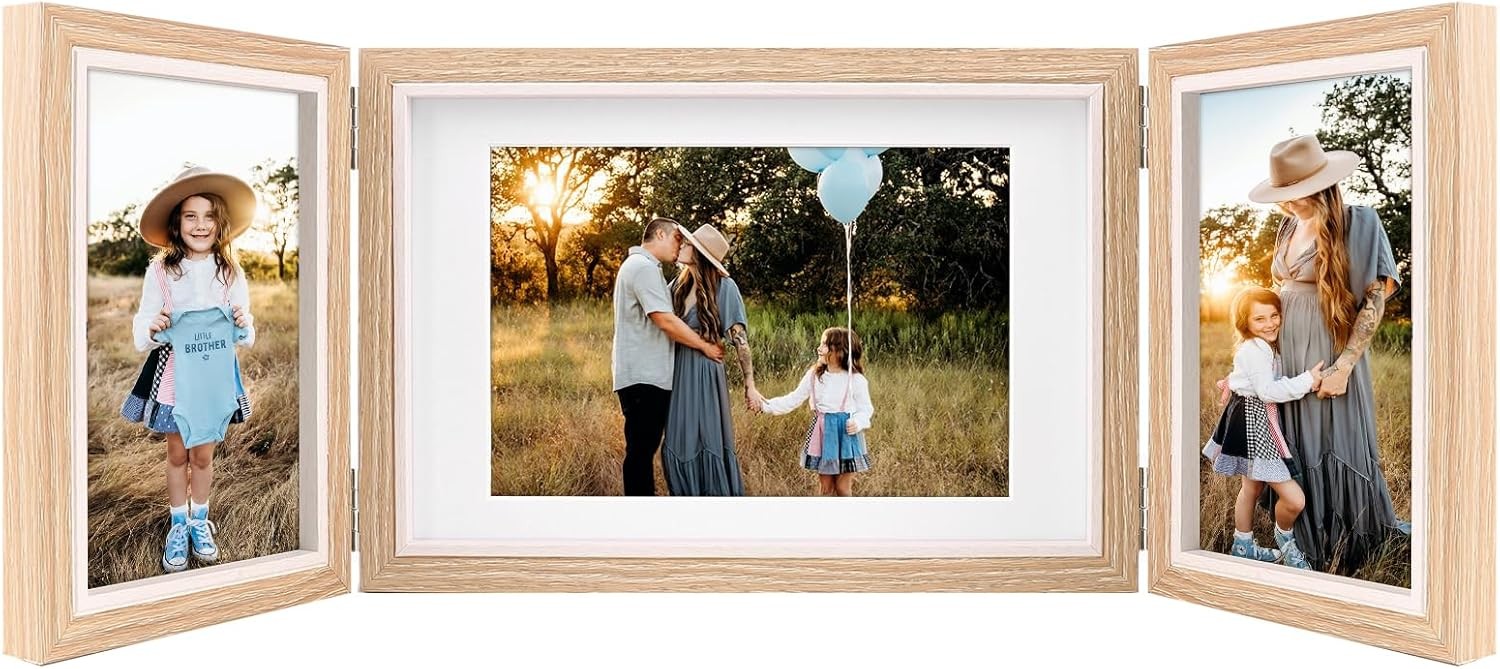 Triple 4x6 Photo Frame Hinged Folding Wood Picture Frame with Glass Front Stand