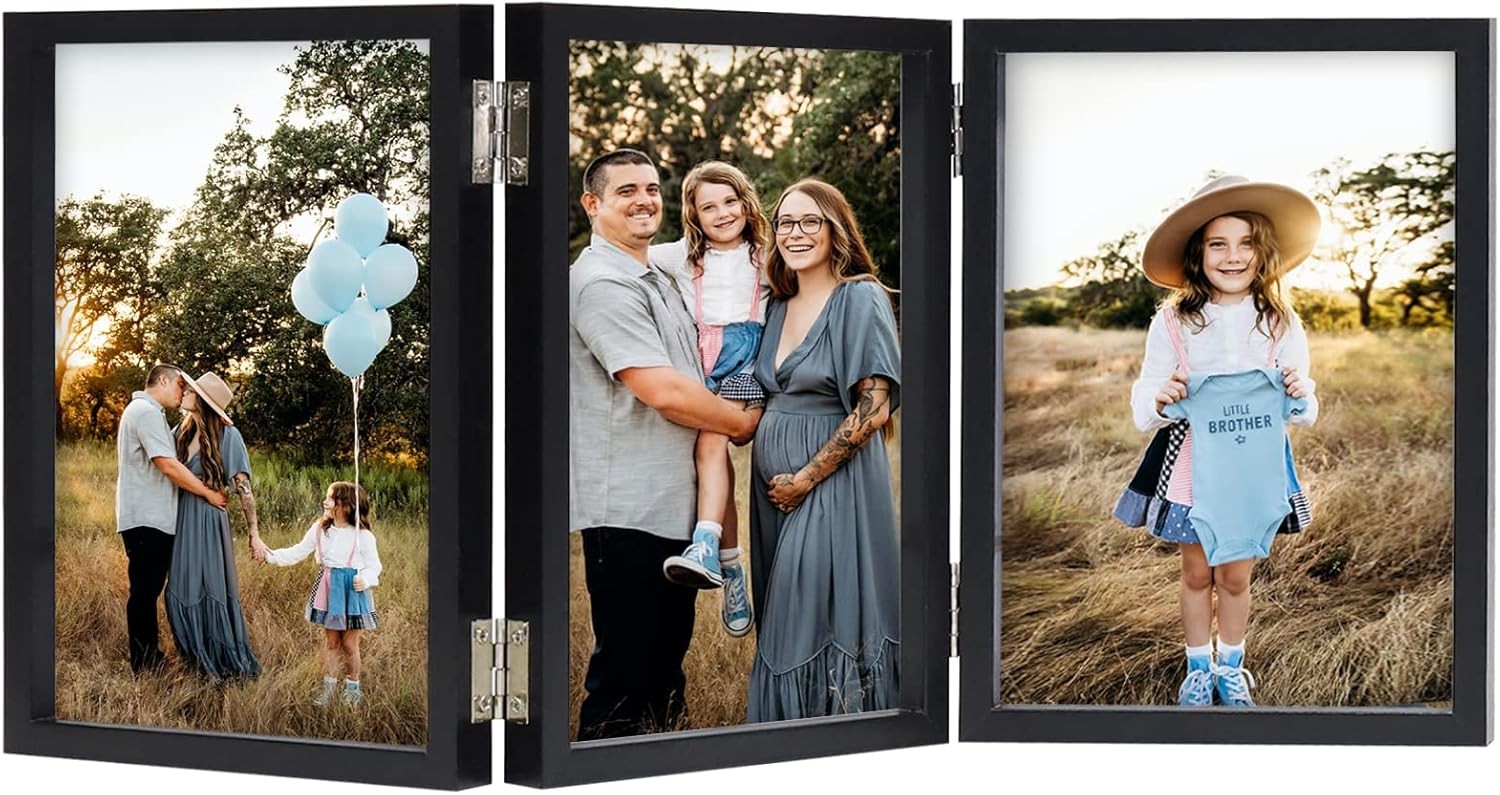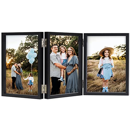 Triple 4x6 Photo Frame Hinged Folding Wood Picture Frame with Glass Front Stand Vertical on Desktop Black
