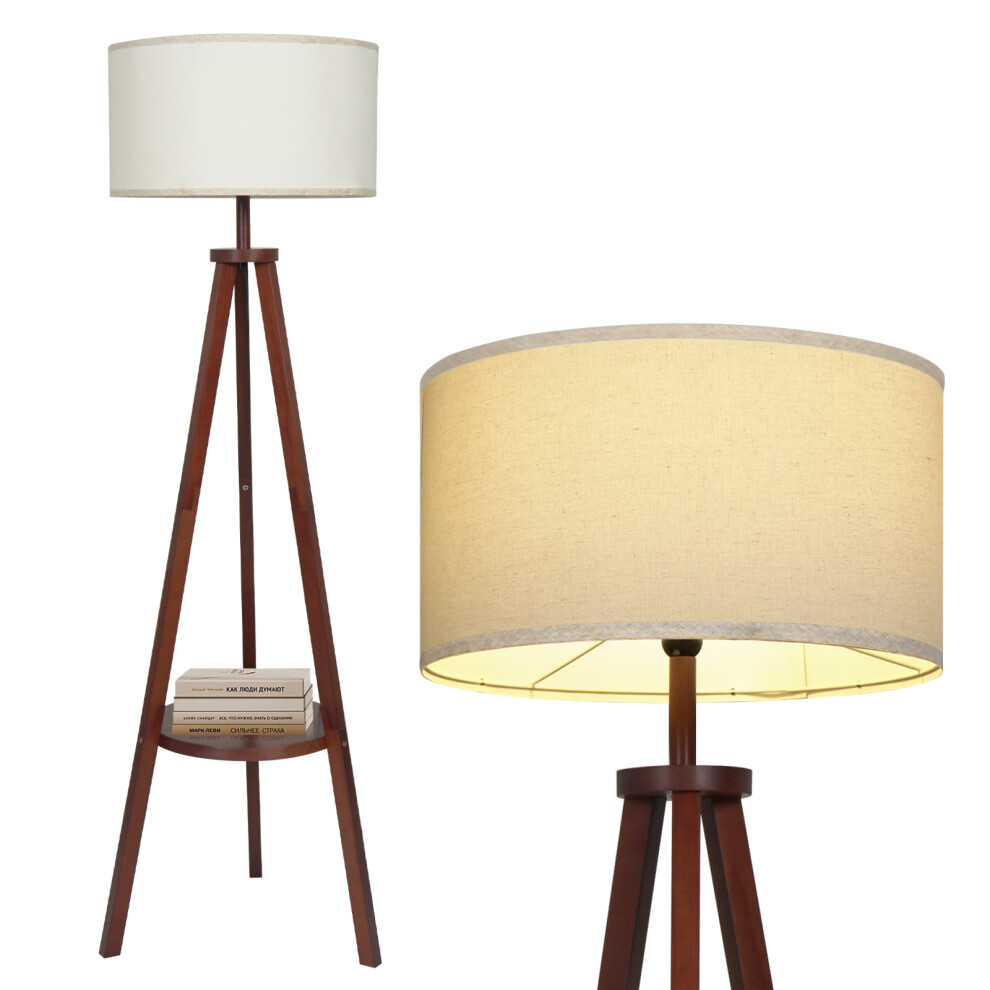Tripod Floor Lamp Reading Light with Storage Shelf Linen Shade Brown