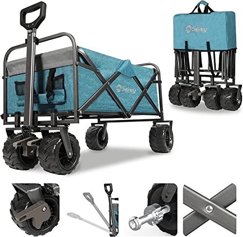 Sekey Folding Festival Trolley with Wide All-Terrain Wheels, 440LB Large Load Capacity, Heavy-Duty Camping Wagon with Brake, Sturdy Beach Garden Cart, Adjustable Handles & Drink Holders, Light Blue