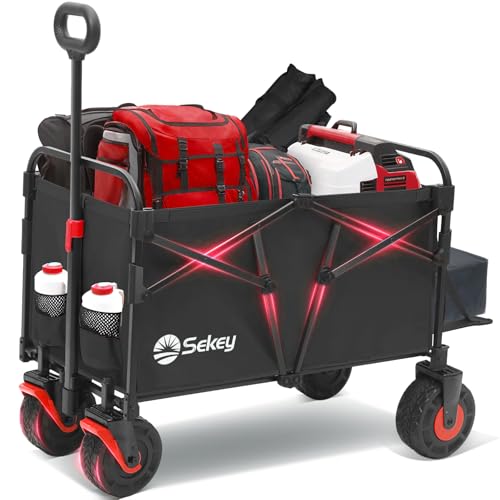 Sekey Folding Festival Trolley with Wide All-Terrain Wheels, 440LB Large Load Capacity, Heavy-Duty Camping Wagon with Brake, Sturdy Beach Garden Cart, Adjustable Handles & Drink Holders, Red