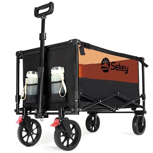 Sekey Folding Festival Trolley with 330LBS Large Capacity, Heavy Duty Camping Beach Wagon, Removable All-terrain Wheels, Collapsible Cart with Adjustable Handle & Drink Holders, Black&Grey