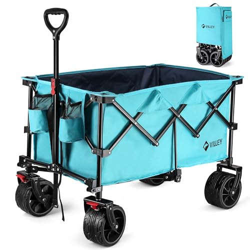 VILLEY Festival Trolley, Collapsible Camping Trolley with Big Wheels, Folding Wagon Cart Loadable up to 102KG, All-Terrain Wheels Wagon with Brakes for Outdoor Picnic Garden Beach