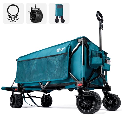 Overmont 300L Extra Large Folding Festival Trolley Cart - All-terrain Wide Wheels and Brake - Heavy Duty Cart Load up 200KG - with Adjustable Handle & Cover Bag - Wagon for Beach Camping Garden blue