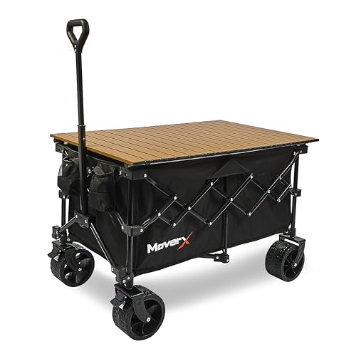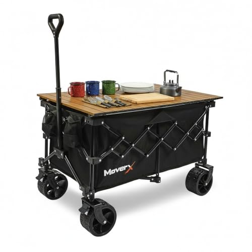 MoverX 200L Camping Trolley on Wheels, Table Folding Wagon, Portable Camping Cart, Foldable Trolly for Festival Beach Outdoor Garden Picnic Shopping Fishing, Wide Wheels, Adjustable Handle, Black