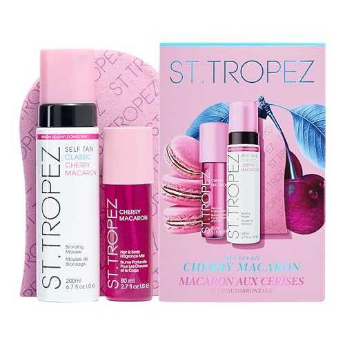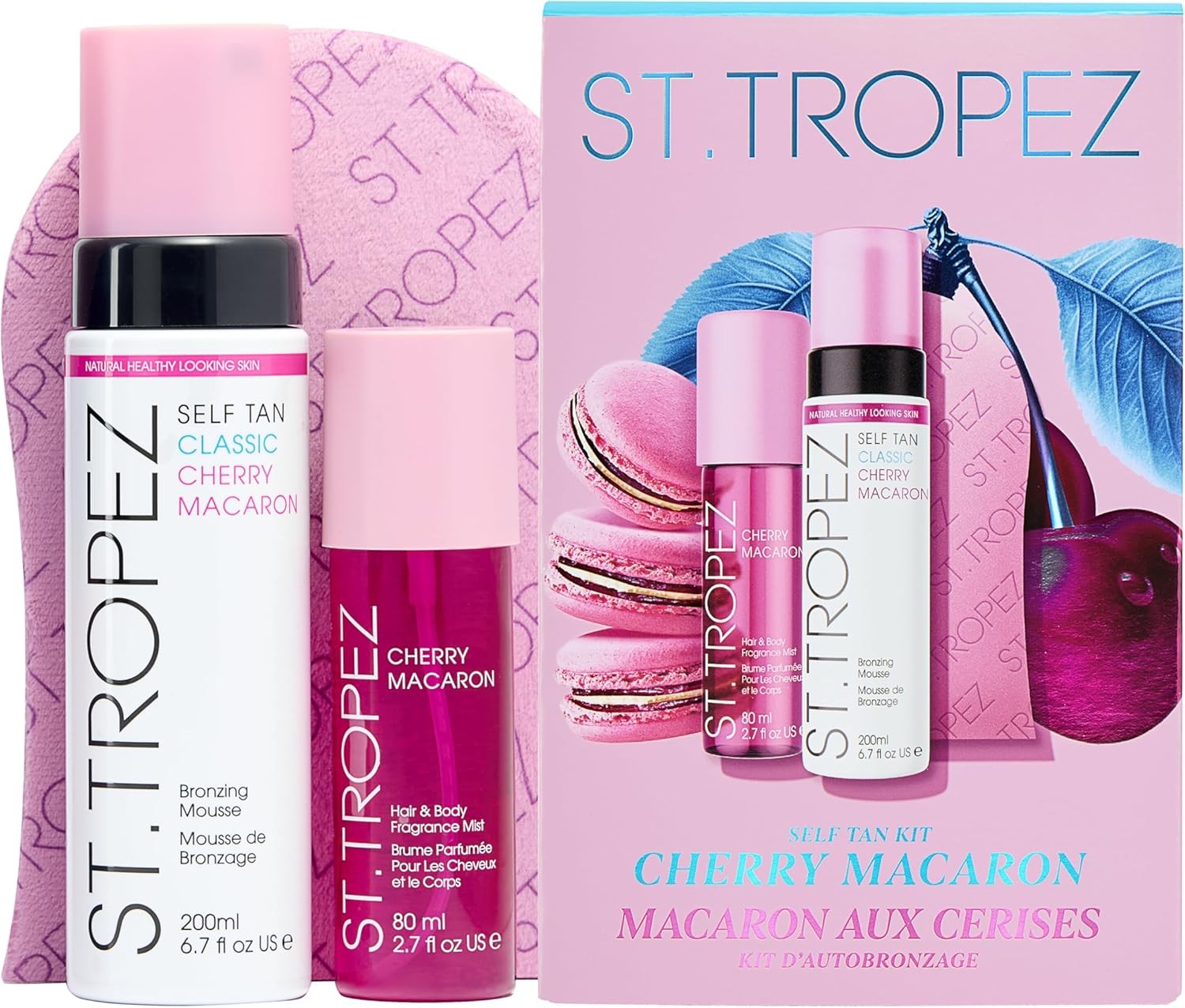 St.Tropez Self Tan Cherry Macaron Kit, Iconic Classic Mousse 200ml, Limited Edition Pink Mitt & New Hair & Body Cherry Macaron Fragrance Mist