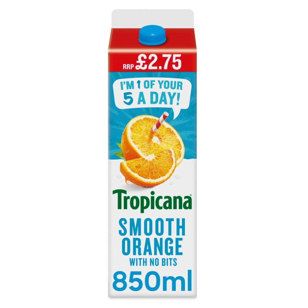 Tropicana - Orange Fruit Juice with No Bits - Long Life Pure Orange Juice, No Added Sugar, No Added Artificial Flavours, with Vitamin C - Breakfast Drink - 6 x 850ml