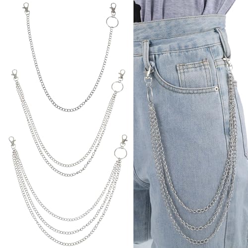HJZHII 3Pcs Pants Chain, Jeans Chains Silver Wallet Chain Hip Hop Rock Punk Chains Metal Belt Biker Trouser Accessory for Keys Belt Loop Purse Handbag Men Women Boy Girl