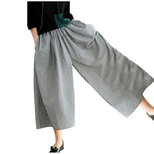 Wide Leg Cropped Trousers for Women Ladies Culottes Elasticated Waist Plaid Gingham Capri Palazzo Pants Lightweight Baggy Trousers Skirt Casual Bottoms for Spring Summer