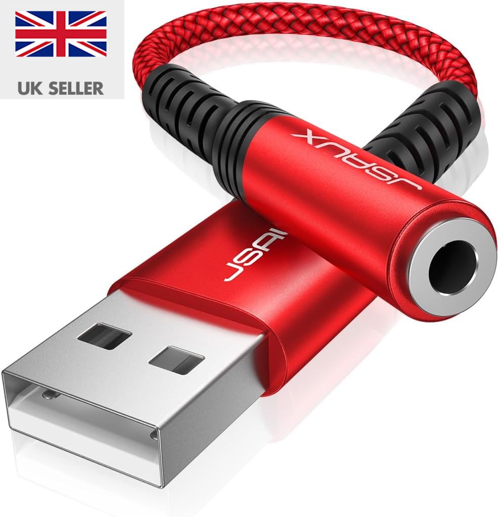 JSAUX USB to 3.5mm Jack Audio Adapter, TRRS 4-pole Stereo External USB Sound Card Aux Headset Microphone Converter with DAC Chip Compatible with Headphone Mac PS4 PC Laptop Desktops -Red