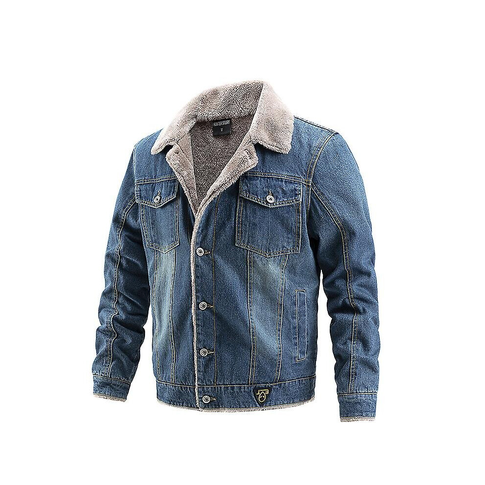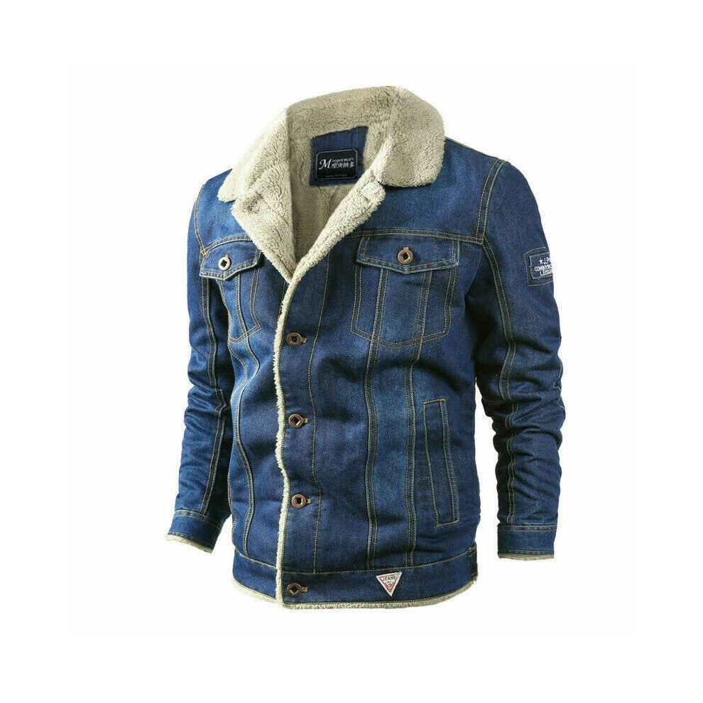 (Dark Blue, L) Winter Warm Denim Jacket Fleece Lined Jean Coat Fur Lapel Collar Trucker Jacket For Men