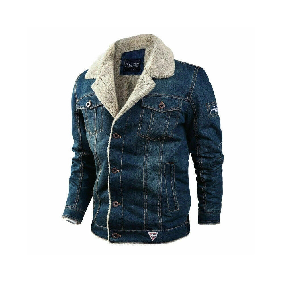(Dark Blue, M) Mens Fleece Lined Winter Warm Jean Coat Trucker Denim Jacket Fur lapel Collar