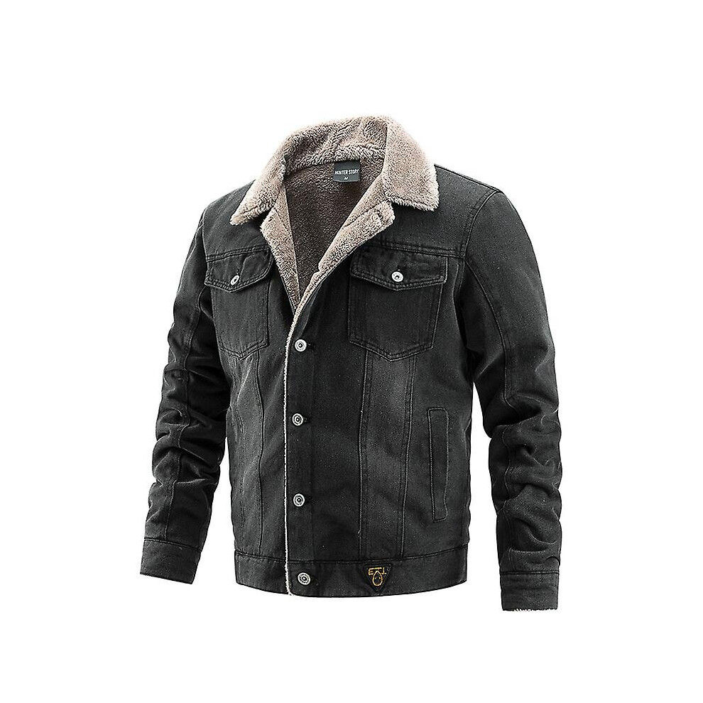(Black, L) Winter Warm Denim Jacket Fleece Lined Jean Coat Fur Lapel Collar Trucker Jacket For Men