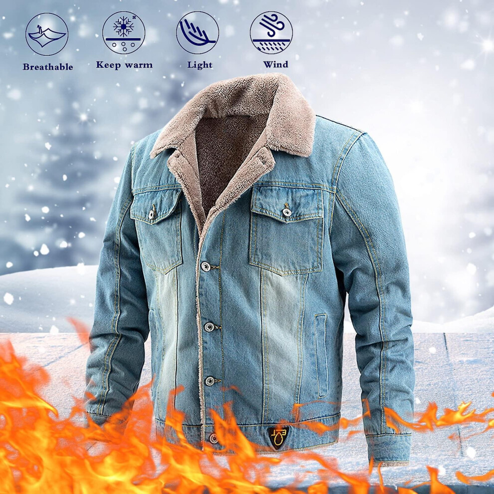 (Light Blue, XL) Winter Warm Denim Jacket Fleece Lined Jean Coat Fur Lapel Collar Trucker Jacket For Men
