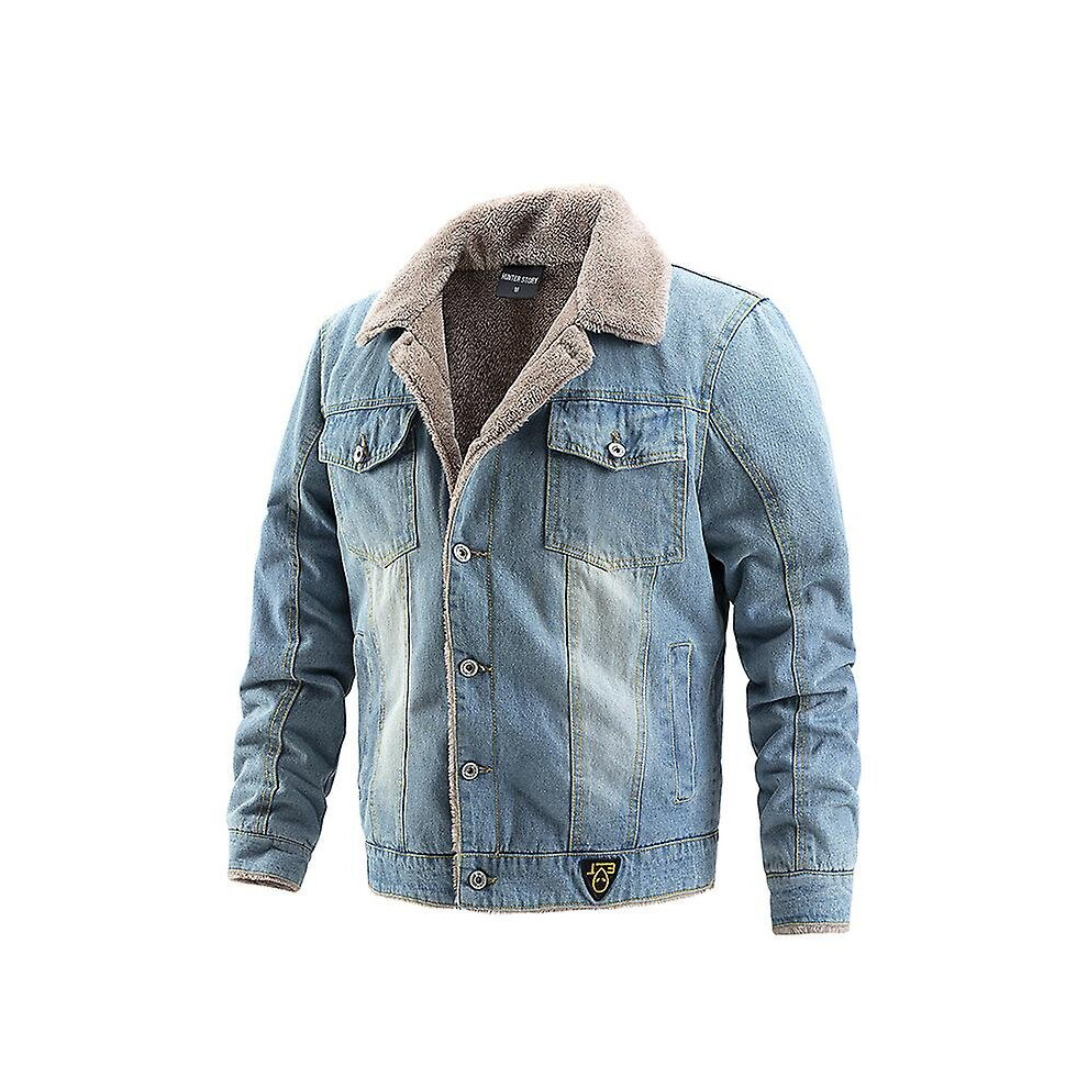 (Light Blue, L) Winter Warm Denim Jacket Fleece Lined Jean Coat Fur Lapel Collar Trucker Jacket For Men