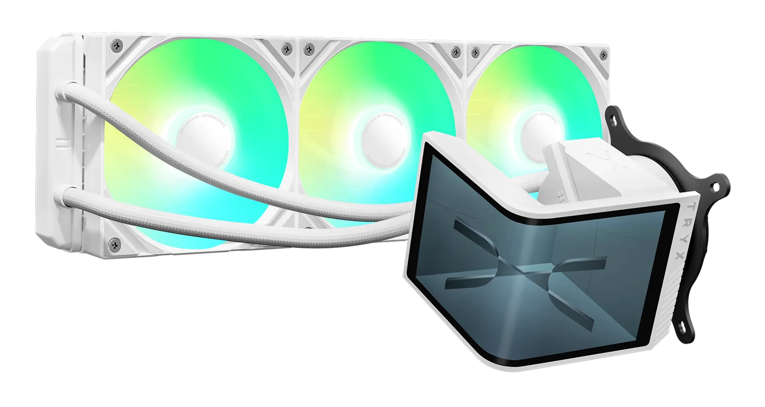 TRYX Panorama 360 ARGB White 360mm AIO Water Cooler | 6.5'' 3D Anamorphic Effect AMOLED Curved Screen – 320W TDP – Magnetic ARGB Fans – for Intel & AMD CPUs
