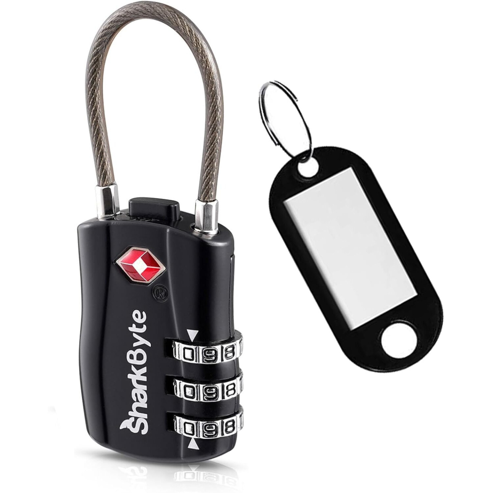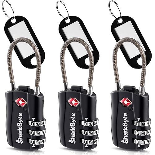 SharkByte TSA Approved Luggage Locks - 3-Dial Security Travel Combination Padlocks with Tags, Flexible Cable Wire Travel Locks for Suitcases, Gym Bags & Small Suitcases - 3 Pack