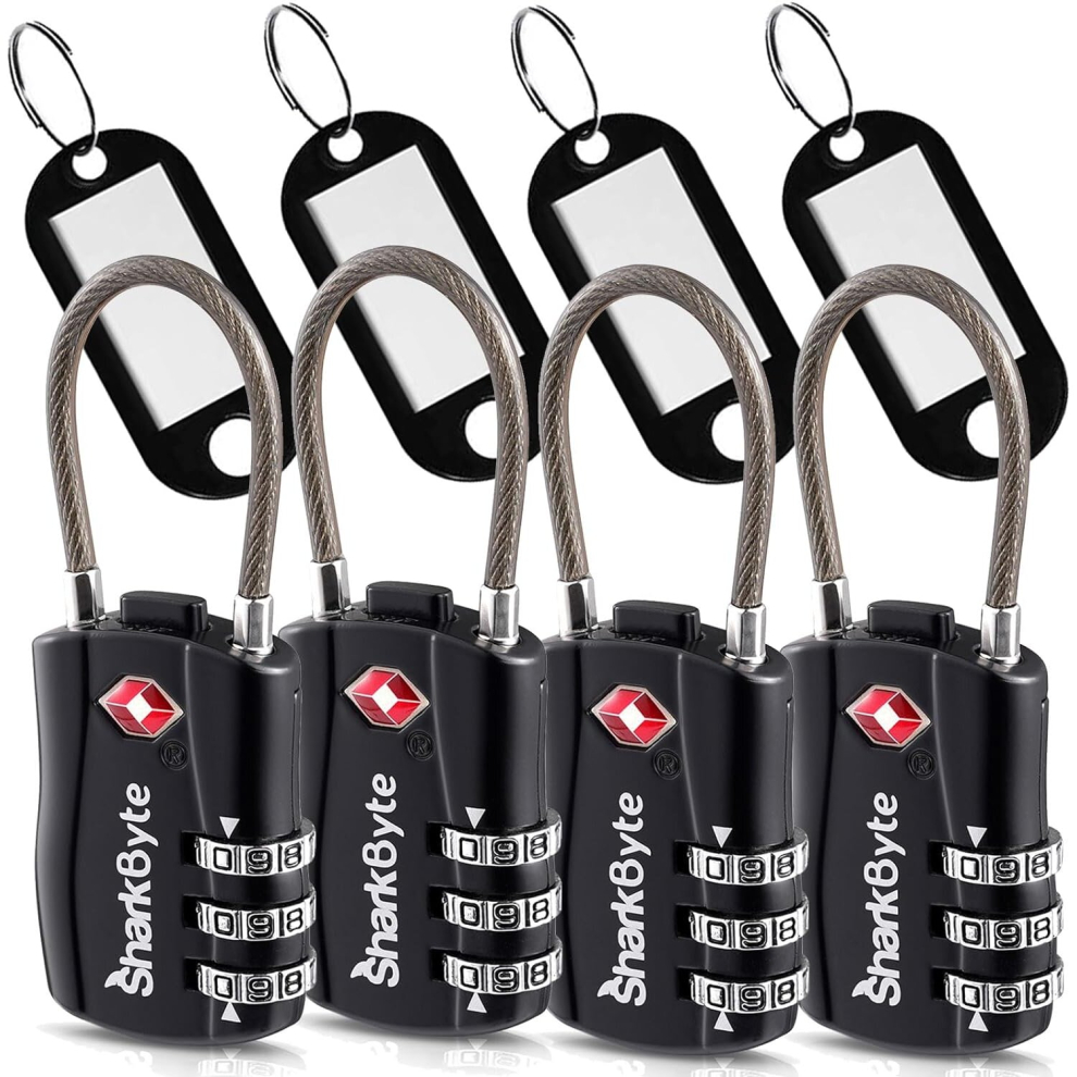 SharkByte TSA Approved Luggage Locks, 3-Dial Security Travel Combination Padlock with Tags, Flexible Cable Wire Travel, Suitcase Locks, Bag, Gym Lock, Small Suitcase Padlock with Code (4 Pack)