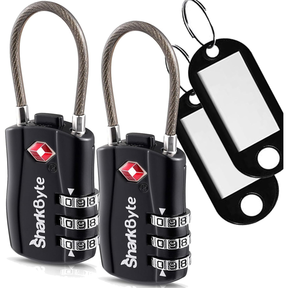 SharkByte Slim TSA Approved Luggage Locks, 3-Dial Security Travel Combination Padlock with Tags, Flexible Cable Wire Travel Lock, Suitcase Locks, Bag, Gym Locker, Small Padlock with Code (Pack of 2)