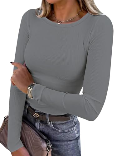 AirMood Women Long Sleeve Casual Ribbed T-Shirts Top Scoop Neck Rib Slim Fit Tunic Tshirt (Gray,L)