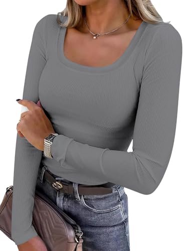 AirMood Women Long Sleeve Casual Ribbed T-Shirts Top Scoop Neck Rib Slim Fit Tunic Tshirt (Gray,XL)