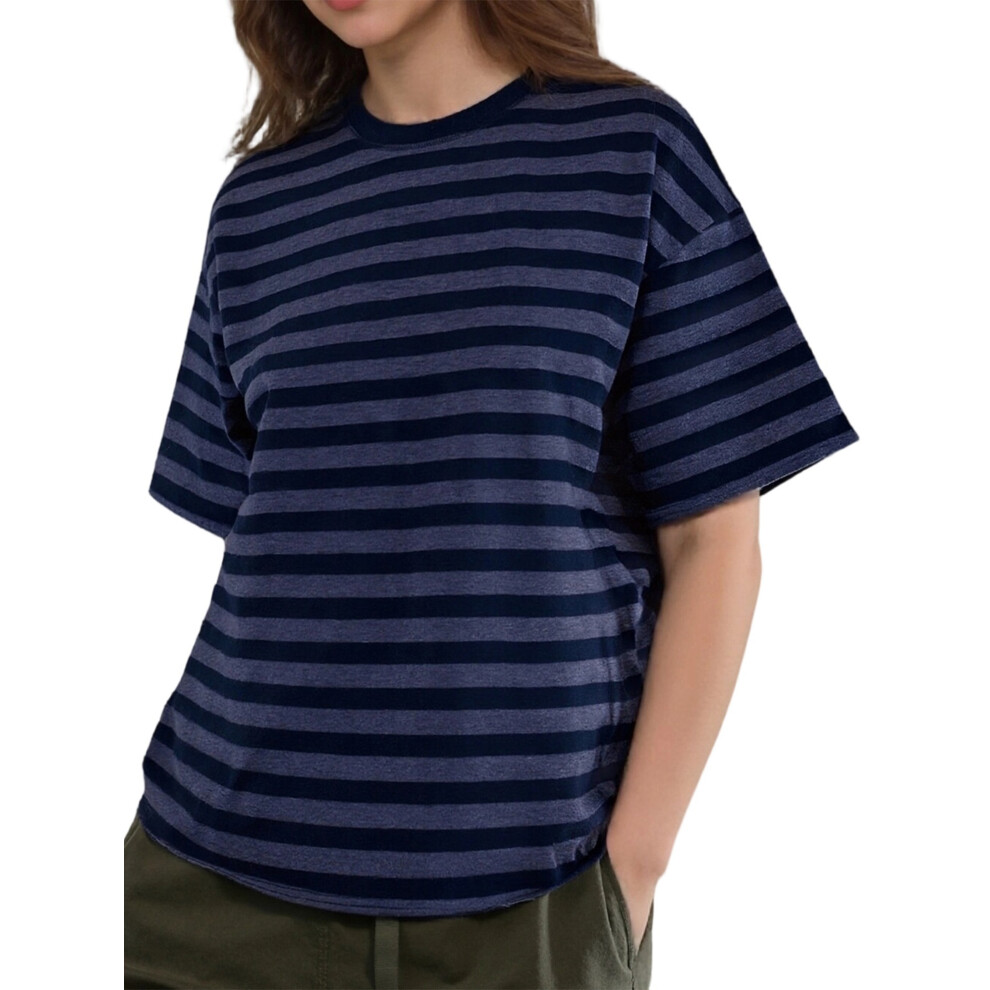 (S, Dark Blue) Striped Summer Tshirt for Maternity Women Loose Casual Contrast Short Sleeve Round Neck Tops