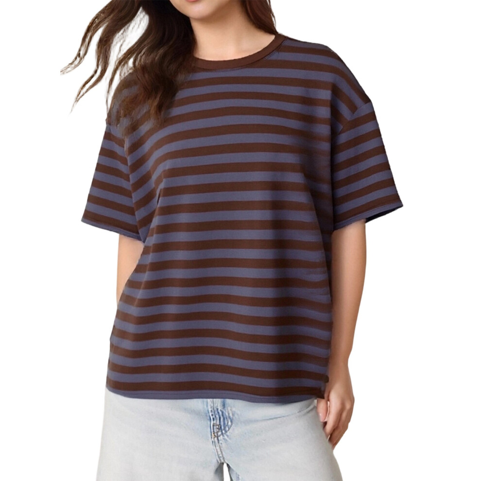 (M, Dark Brown) Striped Summer Tshirt for Maternity Women Loose Casual Contrast Short Sleeve Round Neck Tops